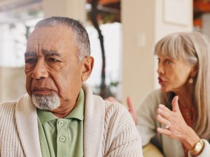 Elderly couple, angry and arguing in lounge, couch and discussion in retirement, weekend and upset in house. Talking, old man and woman in living room, fighting and people in apartment and marriage